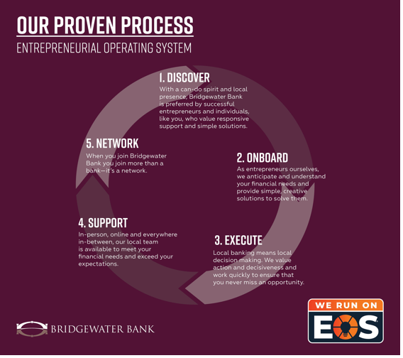 From shared experiences and valuable network connections to greater efficiency, as you consider your banking partner, I challenge you to consider the way an EOS-run bank is uniquely suited to support your business, taking it to the next level. As the bank of choice for EOS-run companies operating in the Twin Cities, the team at Bridgewater Bank would love to connect with you to discuss how we can boost your business’s success.